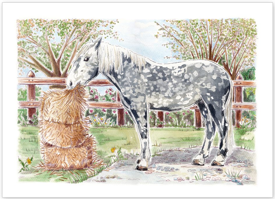 I was delighted to take on this commission as it is not very often that I am asked to paint a horse. I really enjoyed painting his beautiful dappled grey coat and portraying his peaceful nature. Oliver is shown in a homely rural scene slowly tucking into his hay.