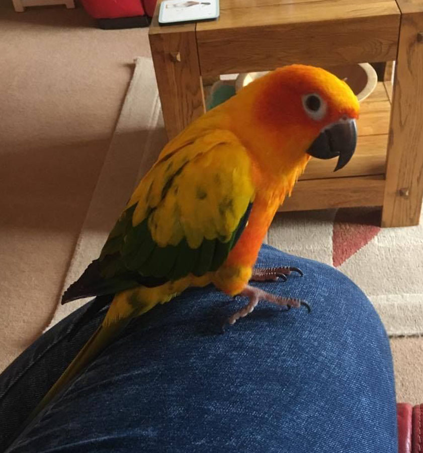 Kiki Parrot is full of character. Very cheerful and very noisy, she enjoys free flying around her owners living room and perching on shoulders! Kiki’s owner requested a painted background of pretty flowers. This time I chose apple blossom to provide contrast with Kiki’s bright feathers.
