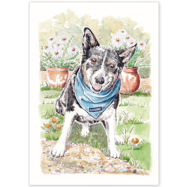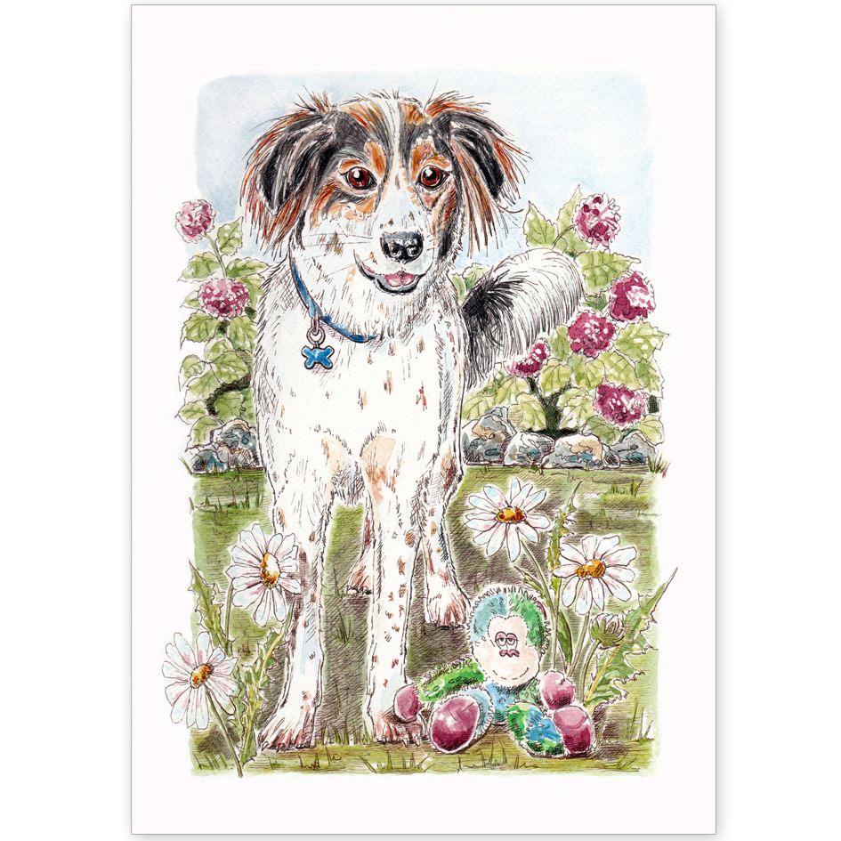 One of the main features of this painting of Ben, a lively and characterful collie springer cross, is the inclusion of his favourite toy – Stinky Minky! Ben is always with Stinky Minky so his owners thought it would be great fun to have him in pride of place at the front of the painting with Ben.