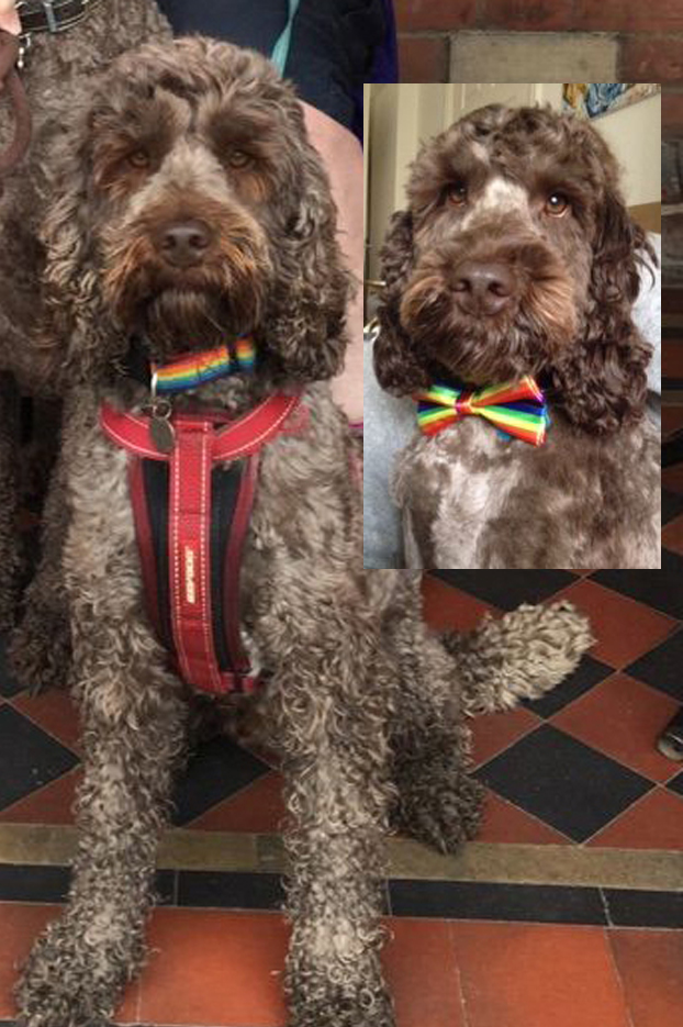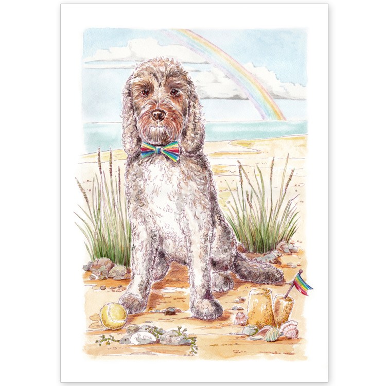 Frank is a Sproodle, half springer spaniel and half poodle. He is a lovely calm animal and faithful friend. He is shown on the beach, his favourite place for a walk. He wears the bow tie he wore as best man at his owners’ wedding and the painting also includes a symbolic rainbow.