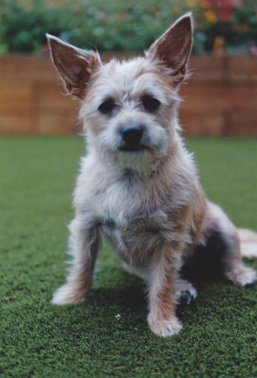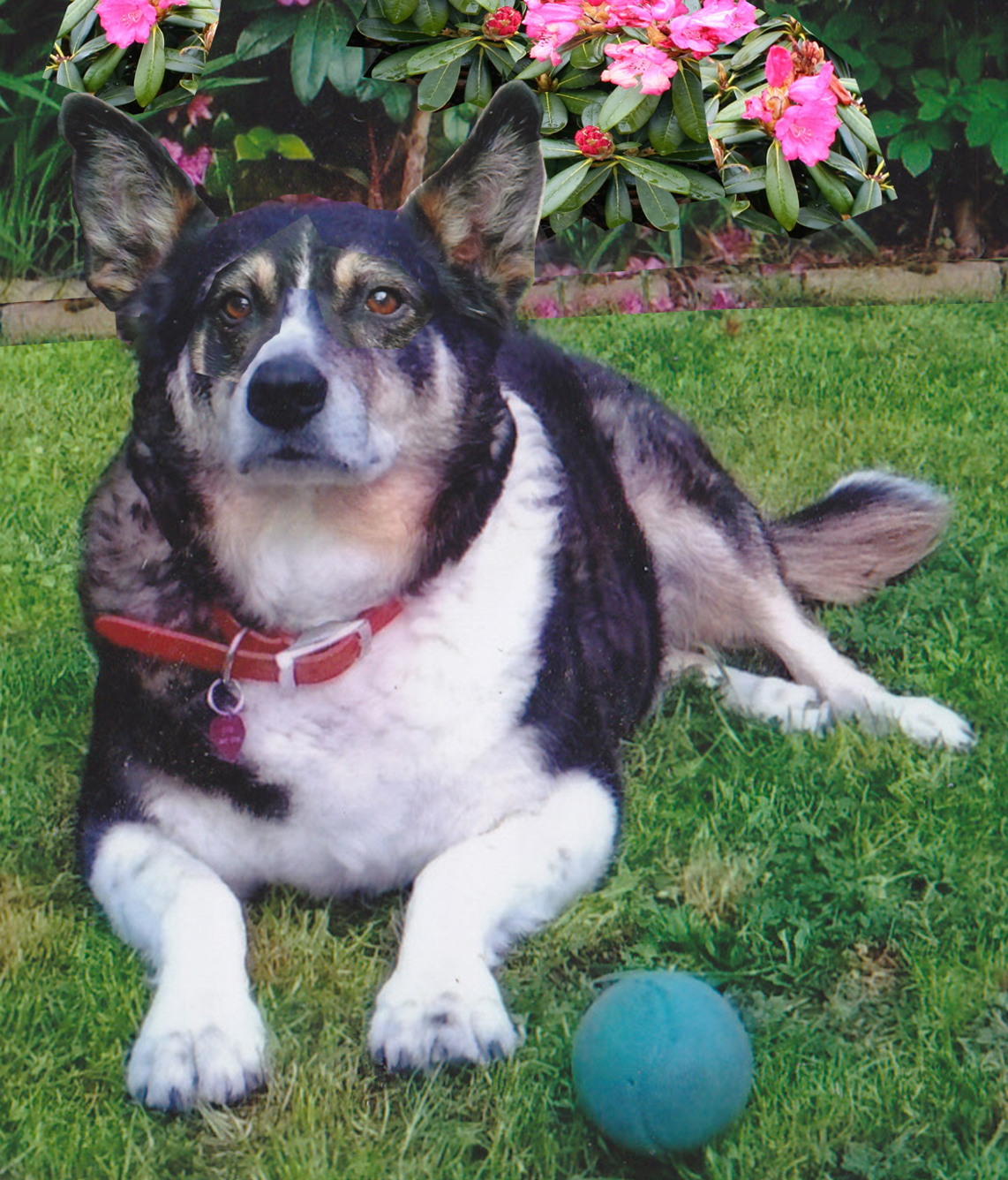Looking closely at the photos of Dolly I could really see her Chihuahua and Jack Russell heritage. She was a really joyful little dog and great fun to paint. She is shown in my painting in her owners’ garden next to their favourite red geranium plants and with her yellow tennis ball.