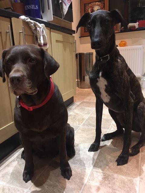 Benji the lurcher and Brooke the chocolate Labrador’s owner wanted a painting of the two doggy friends together. The original photo I worked from was taken in the kitchen but it was decided that it would be far nicer to place them in the garden and with their favourite teddy!