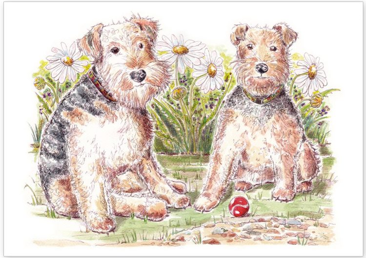 – I know brother and sister, Merlin and Dyllis, very well as they belong to a friend of mine. They are feisty little Welsh terriers, so what a wonderful choice of names! I had a marvellous photo reference to work from then placed them in a garden scene with ox eye daisies.
