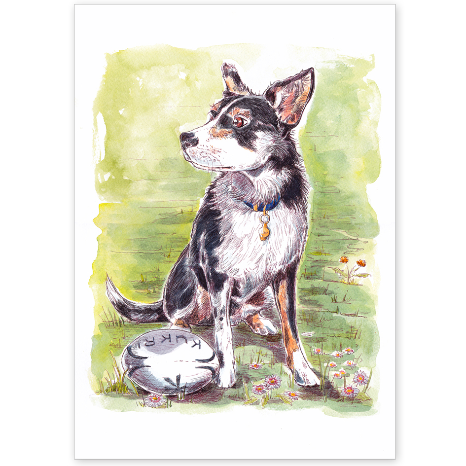 Zak is a really handsome short-haired collie with lots of lovely markings which I really enjoyed painting. As with most collies he is full of energy and loves endless games in the garden most often with his favourite toy, a large rugby ball!