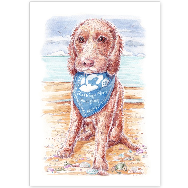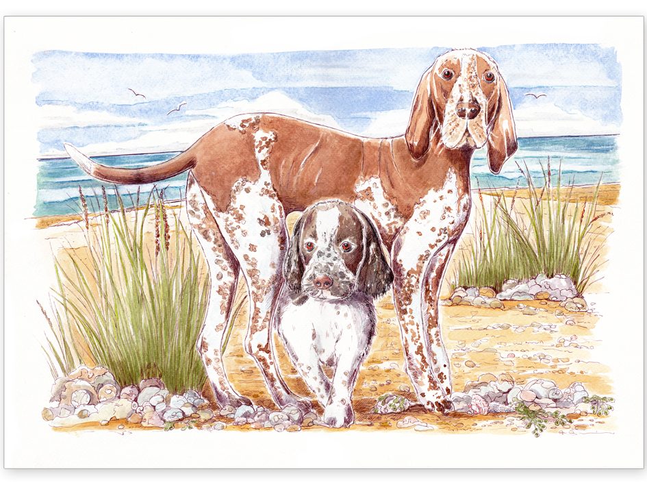 Martha, a Bracco Italiano, and Eddie, an English springer spaniel, are great friends despite their size difference. Another pair of dogs who just love time on the beach playing with each other and their owners, so a seaside scene as a background was requested.