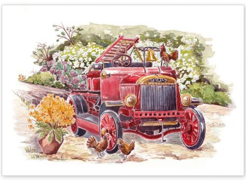 This was commissioned by someone who loved vintage vehicles. This fire engine used to be at Holkham Hall in Norfolk, but is now long gone. Although the photograph showed the vehicle on concrete I placed it in a more rural setting with chickens using it as a perch.