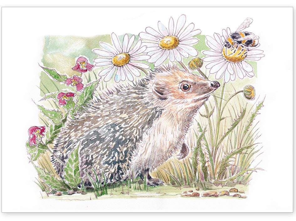 This was commissioned by a gentleman for his wife’s birthday via a gallery. His wife collected anything to do with hedgehogs and he thought it would be a lovely addition to their home. This illustrative painting shows an inquisitive hedgehog amongst the undergrowth and flowers with a little bee on a daisy looking back at him. My customer’s wife was delighted with her unique gift.